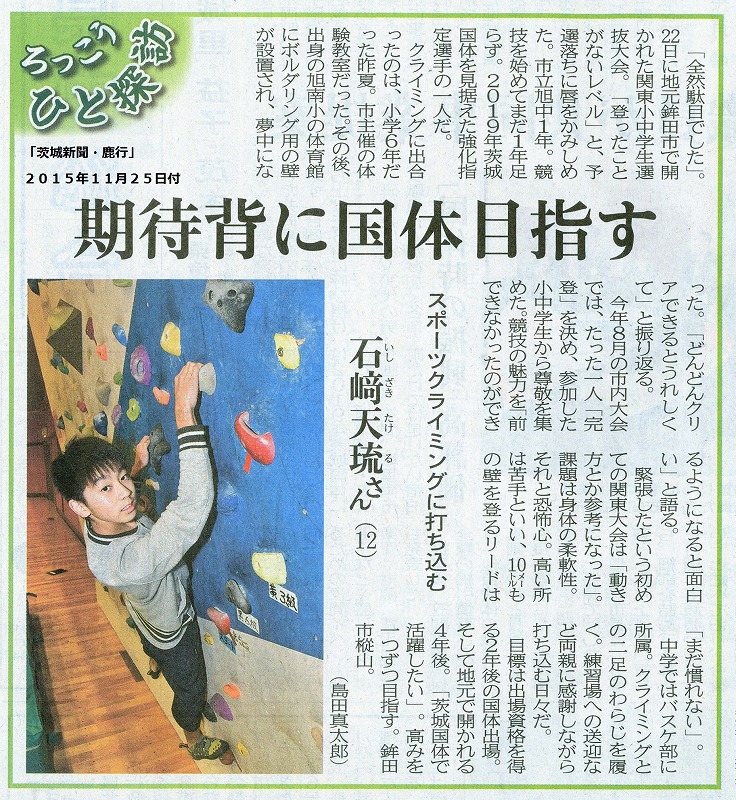 その後,小学校時代から県内のクライミングの練習会や大会に出て,どんどん成長しました。そして,記事にあるよう県内の大会を突破して,関東大会に出場する実力をつけてきています。確かに,上には上の選手がいますが,わずか「1年」あまりの経験でここまで成長しているのは,本人の努力とセンスでしょう。