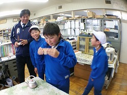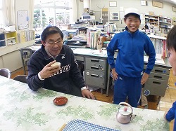 本日(26日)の昼休みです。5年生の男子が3人(N.Hさん,O.Tさん,I.Nさん),職員室に「教頭先生はいますか」とやってきました。「おいしいお茶をごちそうに来ました」とのこと。でも,なんだかニヤニヤと怪しい雰囲気が漂っています。