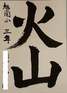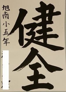 ▼「書写」の部の3年生以上は毛筆です。3年生はN.Iさんの「火山」。伸びやかで元気のある筆づかいですね。5年生はS.Dさんの「健全」。画数の多い「健」の字をバランスよく書いています。