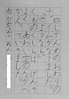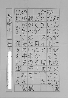 ▼「書写」の作品です。低学年は硬筆です。1年生はW.Mさん。2年生はO.Yさんの作品です。鉛筆で,一文字一文字がしっかりと書けています。