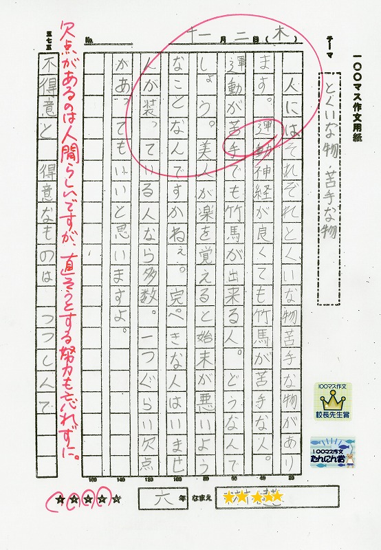6年生のN.Kさんの100マス作文です。タイトルは「とくいな物・苦手な物」。紹介しましょう。