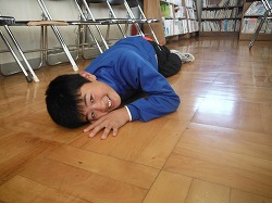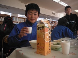 こちらは,N.Kさん。オレンジジュースにはまりました。はじめは小さ目の紙コップで飲んでいましたが,ほぼ1リットル残っていたパックを前に,「100%オレンジ,うまい~」とすべて空けてしまいました。右の写真が,そのアフターです。飲みすぎでしょ。
