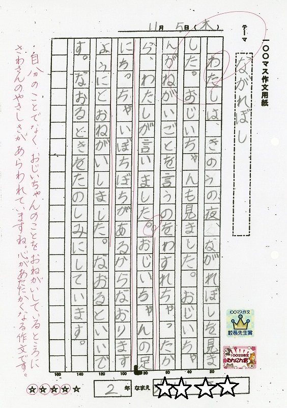わたしは,きのうの夜,ながれぼしを見ました。おじいちゃんも見ました。おじいちゃんがねがいごとを言うのをわすれちゃったから,わたしが言いました。おじいちゃんのに足ちっちゃいぼちぼちがあるからなおりますようにとおねがいしました。なおるといいです。なおるときをたのしみにしています。 」