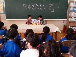 紙芝居は,男子の委員2名の共演。『うなぎにきいて』という楽しい紙芝居です。S.YさんとS.Dさんが絶妙な語りを演じてくれました。内容は関西弁なのですが,それをS.Yさんがちょっととぼけた感じに読んでいます。