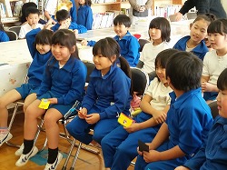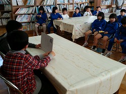 本日(16日)の昼休み,図書委員会の子供たちによる「読み聞かせ」が行われました。紙芝居です。委員長のT.Mさんがてきぱきと集まった低学年の子たちを席に座らせています。さすがです。