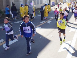 ▼ 小学生の3年生以上の部は2km。男女は別でしたが,どどっとスタートしましたので,スタート時はとても見つかりませんでした。帰ってきたところです。