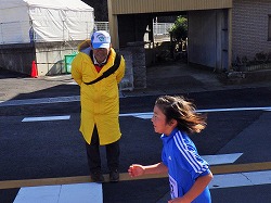 ▲「がんばれ!」 大会のスタッフとして沿道に立つT教務から,本校の児童に声援が送られます。