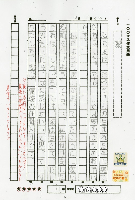 私がようち園にかよっていたころに,「家に名前を付けよう。」と言って,私が付けました。それは,「しろっち」です。家は白くて,おしろみたいにりっぱな感じがいいと思って,付けました。家は,家族の仲間入りです。