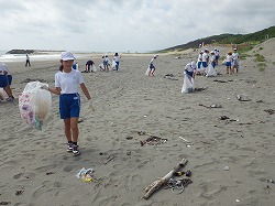 7月,5年生のみんなが総合の学習で,海のゴミ拾いに来てくれました。30分も拾うと,ゴミは軽トラックに山づみになるほど集まりました。ひとりで拾うより楽しかったし,あっという間に集まってうれしくなりました。学校へもどってから,ゴミを分別しました。海に落ちているゴミの多さと,種類の多さに,みんなおどろいていました。海のゴミについて,みんな分かってくれたようで,とても良かったです。