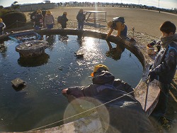 身を乗り出して氷を取っているのは,5年生のN.Hさん。「大きいの,取れそう・・」とチャレンジします。その精神がいいですね。まあ,この体勢ならば頭から突っ込むことはないでしょう。(+_+)