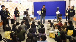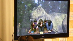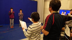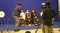 ▼ブルーバックのコーナー。ブルー部分には合成映像がはめ込まれます。魔法のじゅうたんに乗った旭南小の男子3人。ティラノサウルスに食われそうですっ!