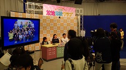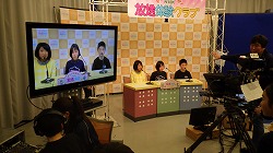 ▼ここが体験のスタジオ。常陸太田市の幸久小の5年生といっしょです。最初に,番組づくりの流れを学びます。S.Sさんがキャスターですね。