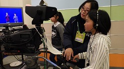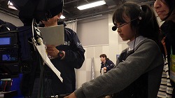 ▼「2カメ」さん。カメラをズームしたり,パン(横に動く)したり。レポーターがブルーバックの前に立っています。手で指示を出すのは,番組づくりで一番大切な役割。見事な指示です。