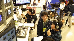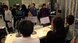 ▼ここではスタジオの中にありますが,本物では別の部屋になる「指令室」(!)。スタジオとインカム(マイク,ヘッドホン)でつながり,すべての指示をだします。「2カメ」前の「カンペ」担当者もスタンバイOKです。