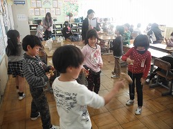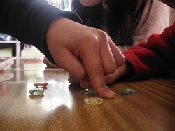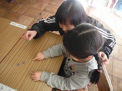 ▼こちらは,「おはじき」。パチンと上手にはじいて,自分の取り分を多くしていく遊びですが,微妙なはじき方と方向感覚が求められます。テクニックをマスターするには,積み重ねが必要ですね。床で遊んでいる子もいました。