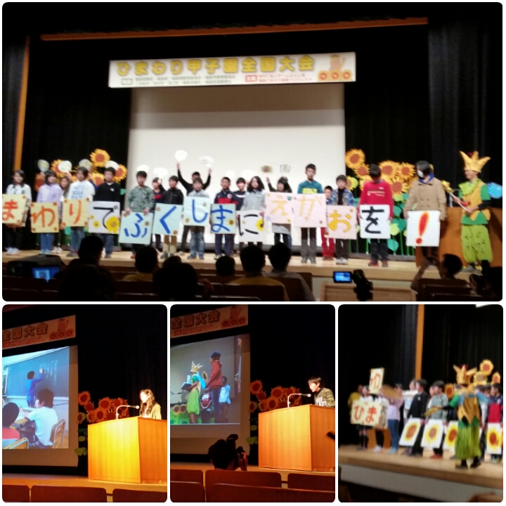 でも、見事に活動発表! 最後には全員がステージに登場して、「ひまわりでふくしまにえがおを!」とアピールしました。本校のキャラクター、ハマユーリンが登場すると、会場がわあっと盛り上りました。🙆