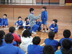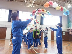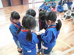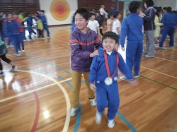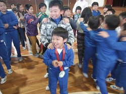 ▲フロアで全校児童が「じゃんけん列車」です。すぐに負けてしまう人,勝ち続ける人,いろいろです。1年生のM.Hさんがいい感じで勝ち残っています。そして,最後は2年生のY.Aさんとの勝負。さて,列車の後ろの子たち全員の気持ちが集中します。