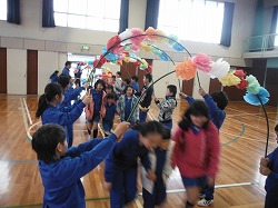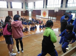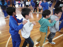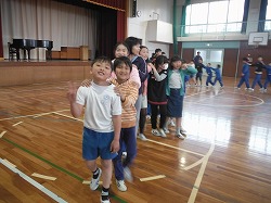 ▲みんなでゲーム。「じゃんけん列車」です。はじめに,6年生たちがやり方を説明してくれました。その本気でじゃんけんの姿が面白くて,とても受けていました。やりますね,6年生!(^o^)丿