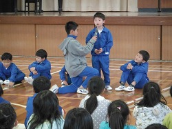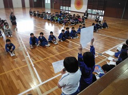 ▲1年生の自己紹介。「僕の名前は〇〇です。好きな動物はチーターです!」などと,しっかりと言うことができました。ひとりひとり,大拍手です。