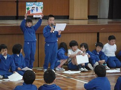 ▲2年生が「南小の1年間」を,絵とお話で紹介してくれました。入学式から始まって,ひまわりプロジェクトや運動会など,わかりやすく説明してくれました。