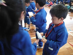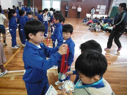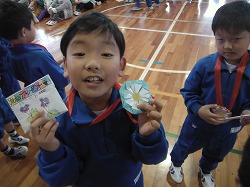 ▲2年生からプレゼントです! 「あさがおのたね」と,メダルです。1年生は大よろこび。女の子5人は,丸くなって「ねえねえ」とおしゃべりも弾んでしまいましたね。(*^^)v