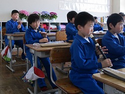 リコーダーの持ち方,扱い方,息の出し方などなど,初めてのリコーダーを吹く体験に,子供たちはとても真剣でした。