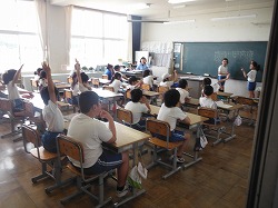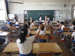 3年生が真剣に(?),話し合いをしています。さて,何を決めているのか,手が挙がります。