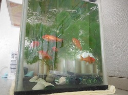 教室の棚の水槽に泳ぐ7匹の金魚。さて,誰が「ササミ」で,誰が「こたろう」なのか。どこで見分けるのか? そのあたりの取材はまたあとで,ということになりそうです。(・・?