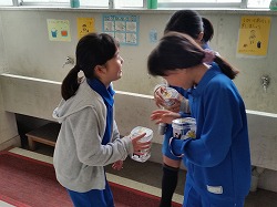初日の募金活動を終えて,廊下で「どうだった?」と互いに確認し合う児童会の5年生のメンバー。自分達がはじめた活動に応えてくれることを実感しています。募金はすぐに職員室に届けられ,保管します。