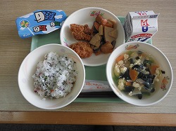 メニューは,「五色花ごはん」「鶏のから揚げ」「タケノコとコンニャクの味噌煮」「たまごスープ」「牛乳」「こどもの日ゼリー」です。(^o^)丿 子供たちの好物がチョイスされ,しかも季節を感じるメニューになっていますね。