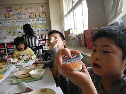 「こいのぼりゼリーを」くばる当番さん。(^o^)丿 最後に食べるデザートの「こいのぼりゼリー」が気になる子もいますね。(#^.^#)