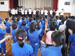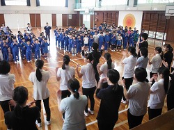 本校では「臨時に全校朝会を設定して児童に紹介しますから」,と学生たちにパフォーマンスを求めまていました。学生たちはみんなで相談をして,ボディパーカッションを考えてきました。本校の子供たちにも簡単な動作活動をさせてくれました。