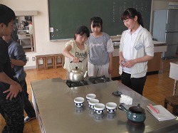 ▲5年生が家庭科で「お茶」の楽しみ方を学びます。おいしいお茶の淹れ方を学びました。6年生は100m走の記録を測ります。大学生が補助活動をしてくれたので,担任はタイム記録に集中できました。