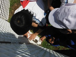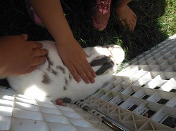 見ると,ウサギの「チャチャ」です。模様が茶色なので,そんな名前になったウサギです。子供たちはウサギと触れ合って嬉しそうです。