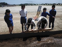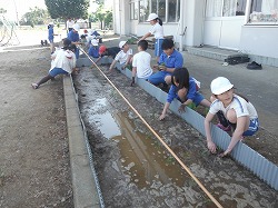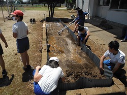 ▼5年生の教室前の花壇を整地して,畦なみ板を打ち込みます。それでなくても元は花壇なので水が漏れます。少しでも漏れないようにするためです。交代しながらの作業。息をあわせて,トントン! いい感じです。