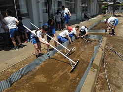 ▼田んぼですから,水をどんどん入れて「代かき」です。子供たちは「ここでお米を作るのだ!」と張り切って作業をしています。何しろ「食べること」への思いは強いようです。(‘◇’)ゞ