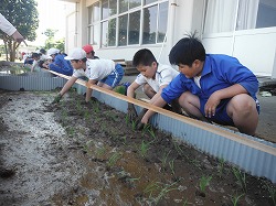 ▼午後には田植え。花壇の田んぼですから,真ん中にも何とか手が届きます。田植えの経験がある子は1人か,2人。それだって,親戚の家で「ちょっとやってみました。」程度です。経験者の校長(子供のころは大人に混じって本気の田植え経験を積んでいます)が指導と修正をして,何とか田植えの感じになりました。