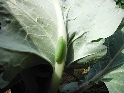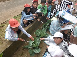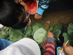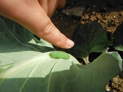 5校時,3年生が花壇で観察中。理科です。「あおむしの観察です!」と元気がいい。キャベツを見ると,確かにあおむしがいます。