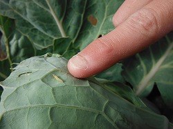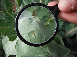 まだ生まれたばかりの小さなあおむしもいます。虫メガネで観察。指の先に,ほら! 大きさが分かります。