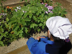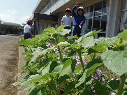 職員室の前の花壇に「ヒマワリ」です。「旭南ひまわりプロジェクト」で育てたヒマワリですね。実は昨年の秋に種取りをして,選別作業をしていたのが,このあたり。やや軽くて実の入りが悪いヒマワリの種が,きっとこのあたりに飛んで落ちたのでしょう。実入りが悪いわりには,あたたかくなったと思ったらすぐに芽を出しました。背丈(?)は40~50cmぐらいです。