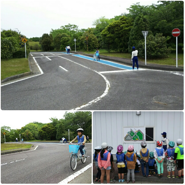 交通公園には,本物そっくりの道路があります。その中を「正しい自転車の乗り方」で回ります。出発時の確認や,交差点での自転車の通り方,停止線での停まり方など,交通公園の指導員の方々がていねいに教えてくれました。子供たちも真剣に学ぼうとしていました。
