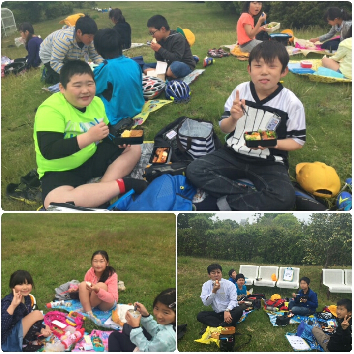 交通公園の敷地内はとても広くて,お弁当を食べるところもあります。一面が芝生の広場でみんなでお弁当開きを始めました。ちょっと,遠足の気分です。(^_-)-☆