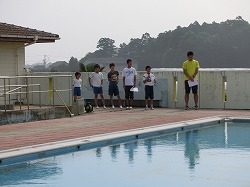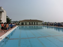 プールに水も満杯になって、いよいよ「プールの季節」です。本日の朝、青空の下で「プール開き」を行いました。進行するのは体育委員会の児童たちです。