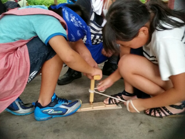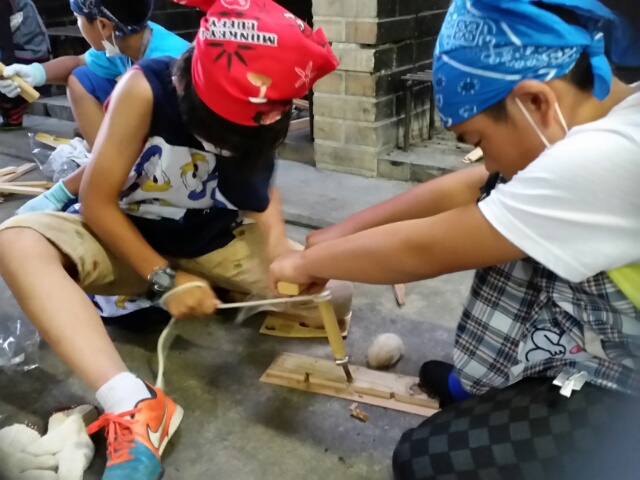 カレーライスを作るには、火をおこさなくてはなりません。マッチやライターを使えば簡単ですが、今回の宿泊学習では、火おこし器を使いました。