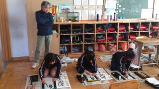 机に座って書く子どもたちと膝をついて書く子どもたちそれぞれのスタイルで書き初めを行いました。
