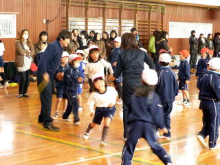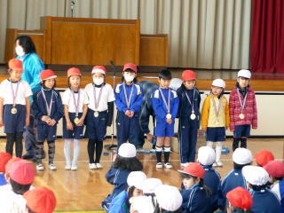 なわとび大会が開かれました。個人種目は,1年生2分間,2年生2分半,3年生3分間,4年生3分半,5年生4分間,6年生5分間の時間跳びです。たくさんの児童がクリアして,メダルを受け取りました。長縄の部では5分間で6年生が565回で優勝,5年生が517回で準優勝,4年生が450回で第三位の結果でした。