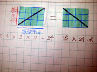 算数の授業でひし形の面積を調べました。いろいろな意見がノートにまとめられたので,紹介します。