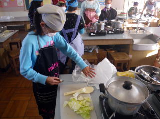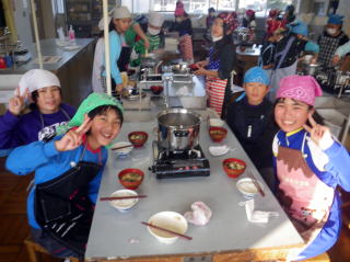 5年生が調理実習でごはんとみそ汁を作りました。ごはんは炊飯器を使うグループと鍋で炊くグループに分かれました。みそ汁は8つのグループに分かれて作りました。初めて作ったごはんとみそ汁だったけど,とてもおいしくできました。