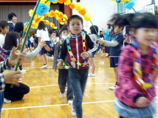 1年生を迎える会が開かれました。1年生の自己紹介や縦割り班の上級生たちと,じゃんけん列車や伝言ゲームをして楽しく遊びました。首飾りをもらって喜んでいる1年生の姿が印象的でした。