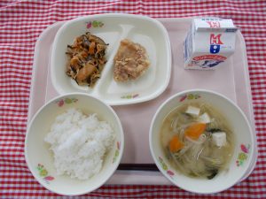 今日の給食は,ごはん,牛乳,手作りからあげ,切り干し大根の煮物,鮭汁です。